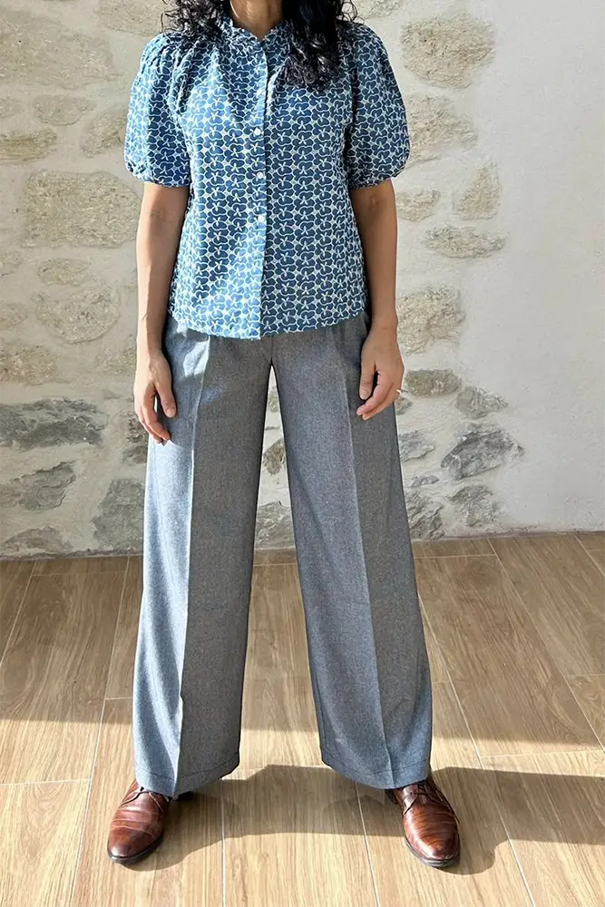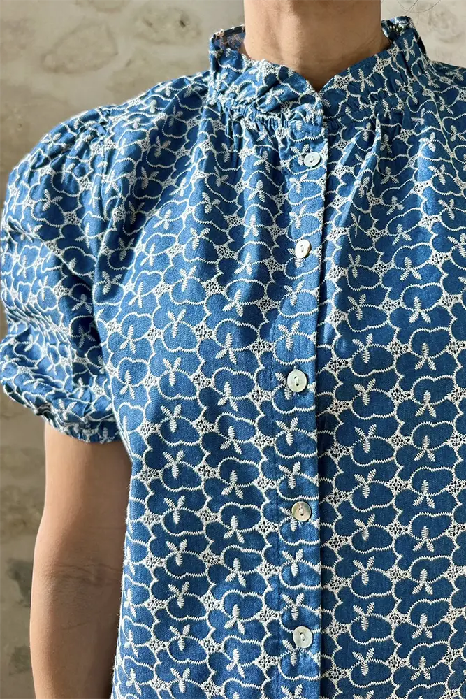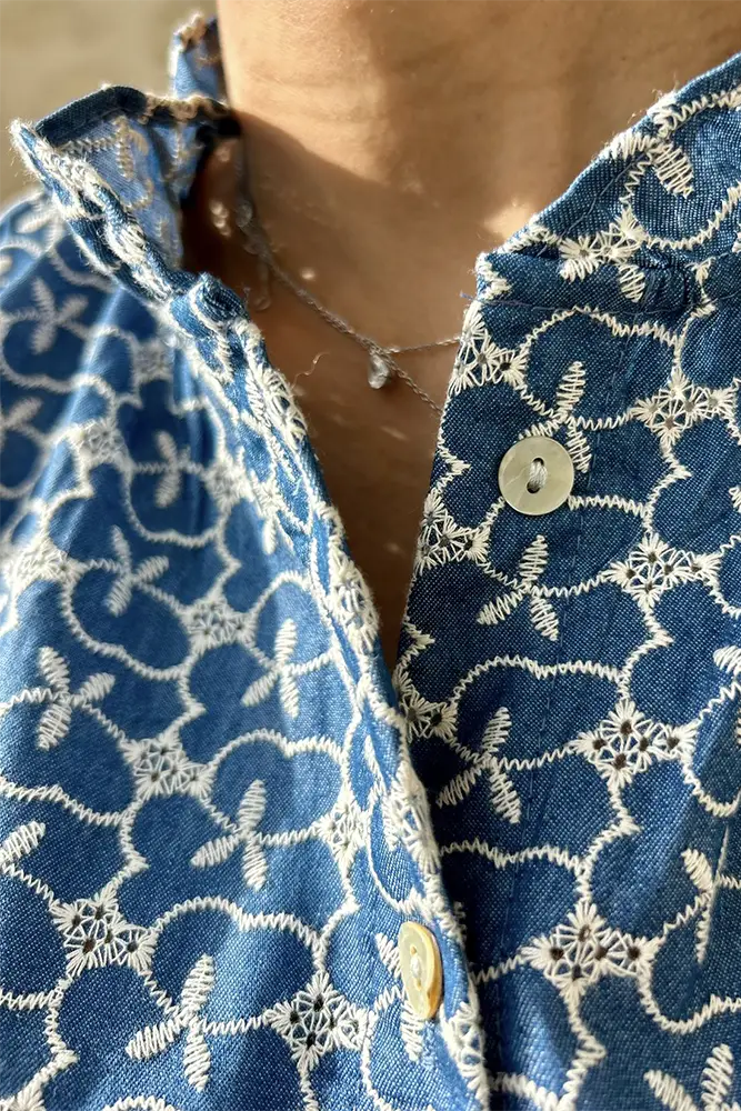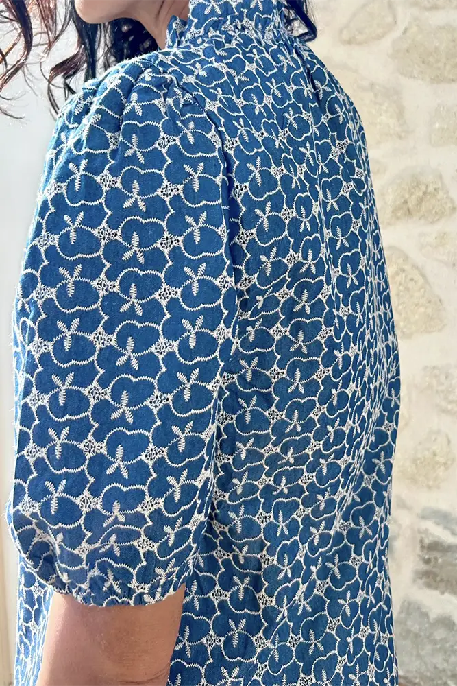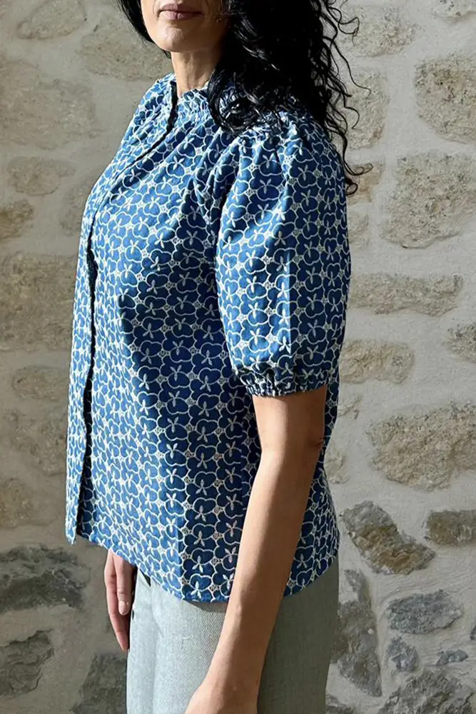 Ce chemisier bleu avec des motifs blancs délicats est parfait pour un look frais et intemporel. Conçu dans un tissu léger et confortable, il offre une coupe décontractée qui convient à toutes les saisons. Les motifs blancs ajoutent une touche subtile de raffinement, créant un contraste délicat qui met en valeur la couleur bleue du chemisier. Les manches courtes assurent une sensation de légèreté et de fraîcheur tout au long de la journée.