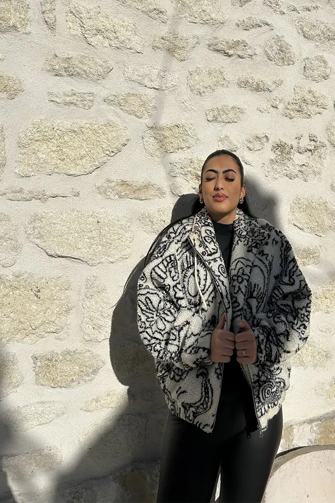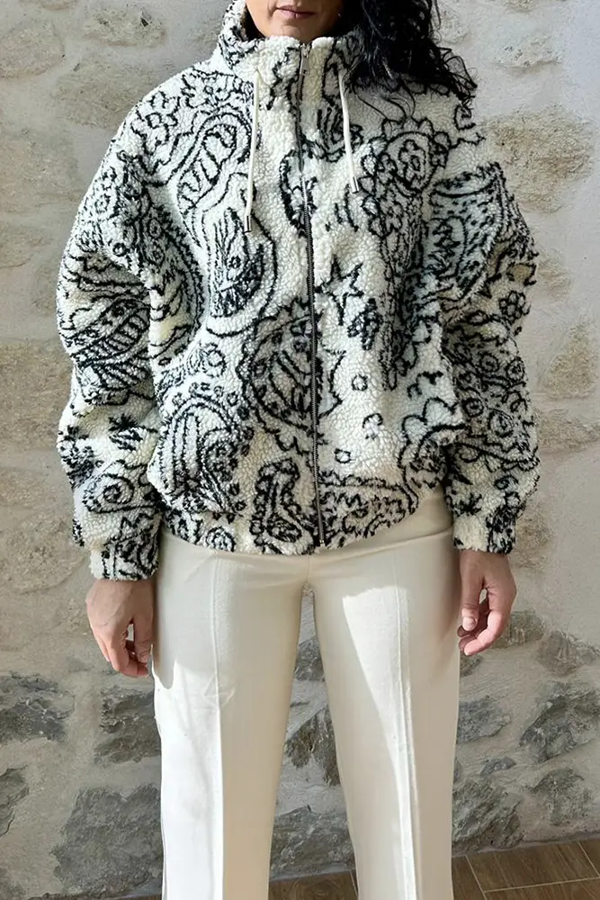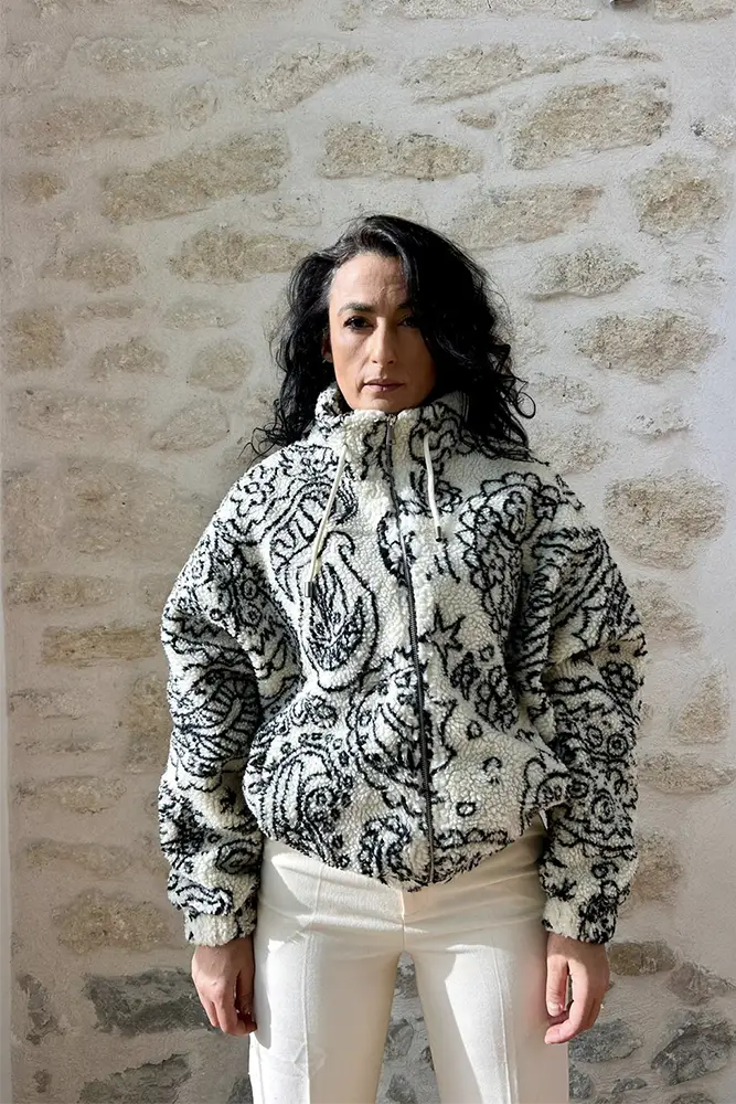 Gilet en laine bouclée épaisse, alliant confort et style. Il présente un design à motifs noirs sur fond écru, apportant une touche artistique et moderne. Doté d’une fermeture zippée sur le devant, ce gilet offre une coupe ample pour un look décontracté et tendance. Le col montant avec cordons ajustables ajoute une touche pratique et chaleureuse, idéale pour les journées fraîches. Les manches longues et la texture moelleuse assurent un maximum de confort tout en restant chic.