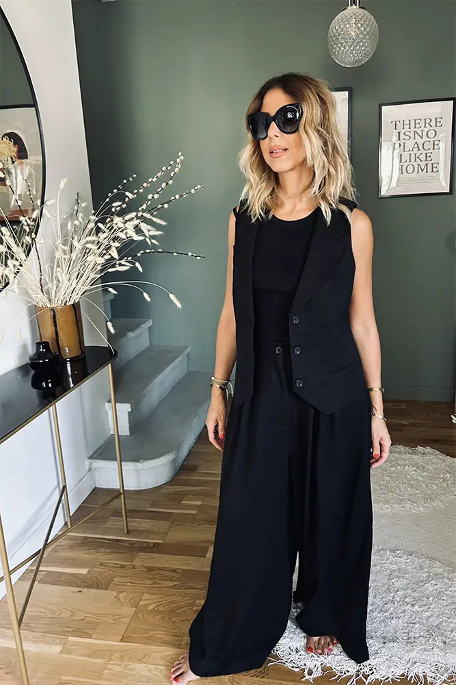 Le gilet se distingue par un double boutonnage discret à l’avant, ajoutant un détail sophistiqué et classique. Les boutons ton sur ton renforcent l’élégance du modèle. Ce gilet est une pièce polyvalente qui peut être superposée à une chemise ou un t-shirt, ou portée sur une robe, selon les occasions et le style recherché.