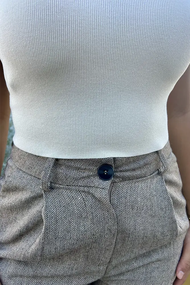 Il est doté de poches latérales pratiques et d’une fermeture classique à bouton et braguette discrète. Les plis subtils à l’avant ajoutent une touche de raffinement, donnant du volume à la coupe tout en restant élégants. Ce pantalon beige est idéal pour des tenues professionnelles ou des occasions plus décontractées, tout en restant chic.
