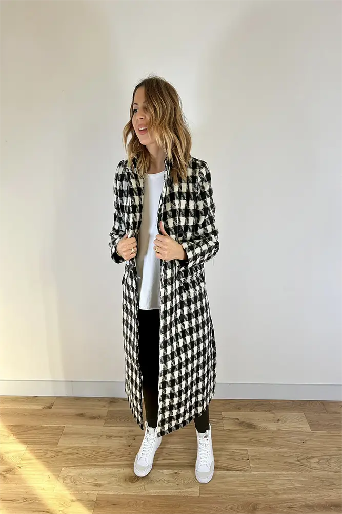 Le manteau à carreaux noir et blanc est une pièce de vêtement élégante et intemporelle qui apporte une touche de sophistication à votre tenue.