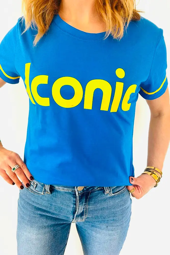 Ce t-shirt bleu avec écriture « iconic » en jaune est un véritable statement piece qui vous permettra d’affirmer votre personnalité et votre style unique.