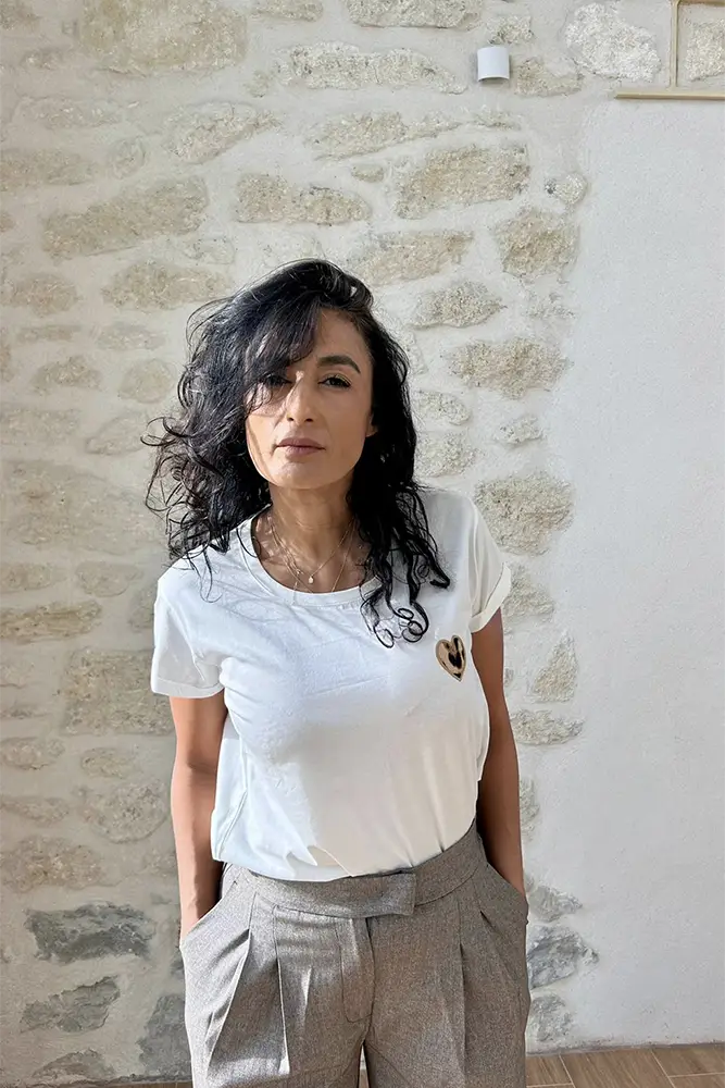 Ajoutez ce t-shirt intemporel à votre collection pour un look minimaliste avec une pointe de caractère. Disponible en plusieurs tailles.