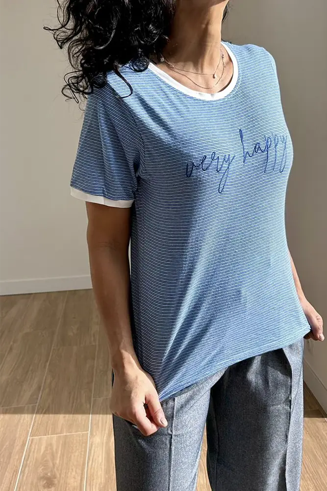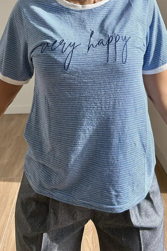 Ce Top Happy Bleu est une pièce incontournable pour un look décontracté et joyeux. Confectionné dans un tissu doux et confortable, il présente une coupe droite classique qui s’adapte à toutes les morphologies.