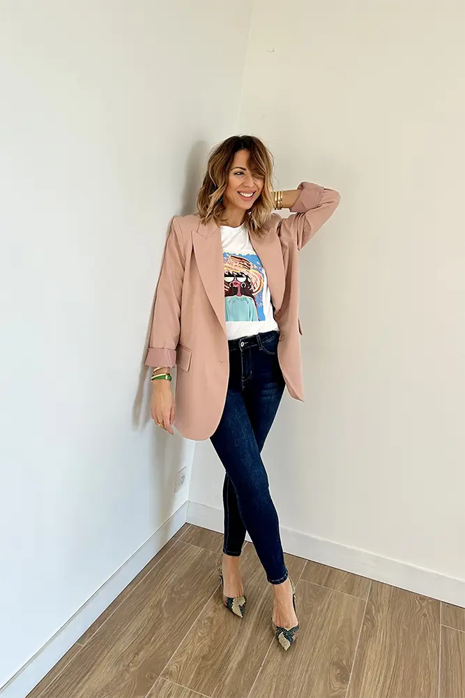 Le pantalon rose douceur est  directement sur notre site, créant une coordination parfaite avec le blazer.